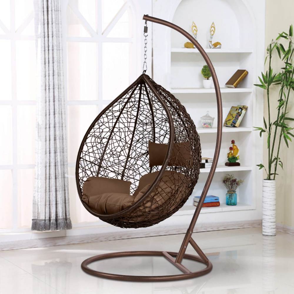 Размер корзины: H105хW94хD65 см Стойка: H2,0xD1,0 м, Каркас сталь. Материал плетения на корзине: искусственный ротанг коричневого цвета. Подушка бежевая. Ткань с водоотталкивающей пропиткой. Допустимая нагрузка: 120 кг.